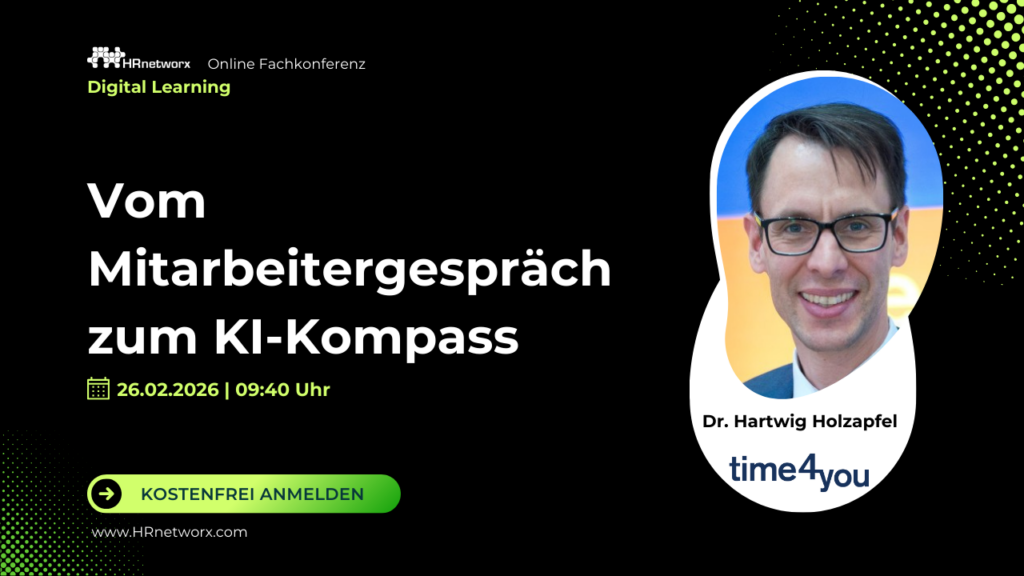 Künstliche Intelligenz verändert Rollen, Aufgaben und Anforderungen in Unternehmen rasant. Doch wie lässt sich erfassen, welche Skills künftig gebraucht werden – und wie bereit die eigene Organisation für die KI-Ära ist? Im Webinar Vom Mitarbeitendengespräch zum KI-Kompass zeigt Dr. Hartwig Holzapfel, Mitglied der Geschäftsleitung der time4you GmbH, wie Unternehmen erfolgreich den Bogen spannen: von Mitarbeitendengesprächen über Learning Management Systeme bis hin zu unternehmensweiten Skills Assessments. Der Vortrag von Dr. Holzapfel ist Teil der HRnetworx Online Fachkonferenz „Corporate E-Learning und die Kunst des Wissensmanagements“ am 26. Februar 2026.